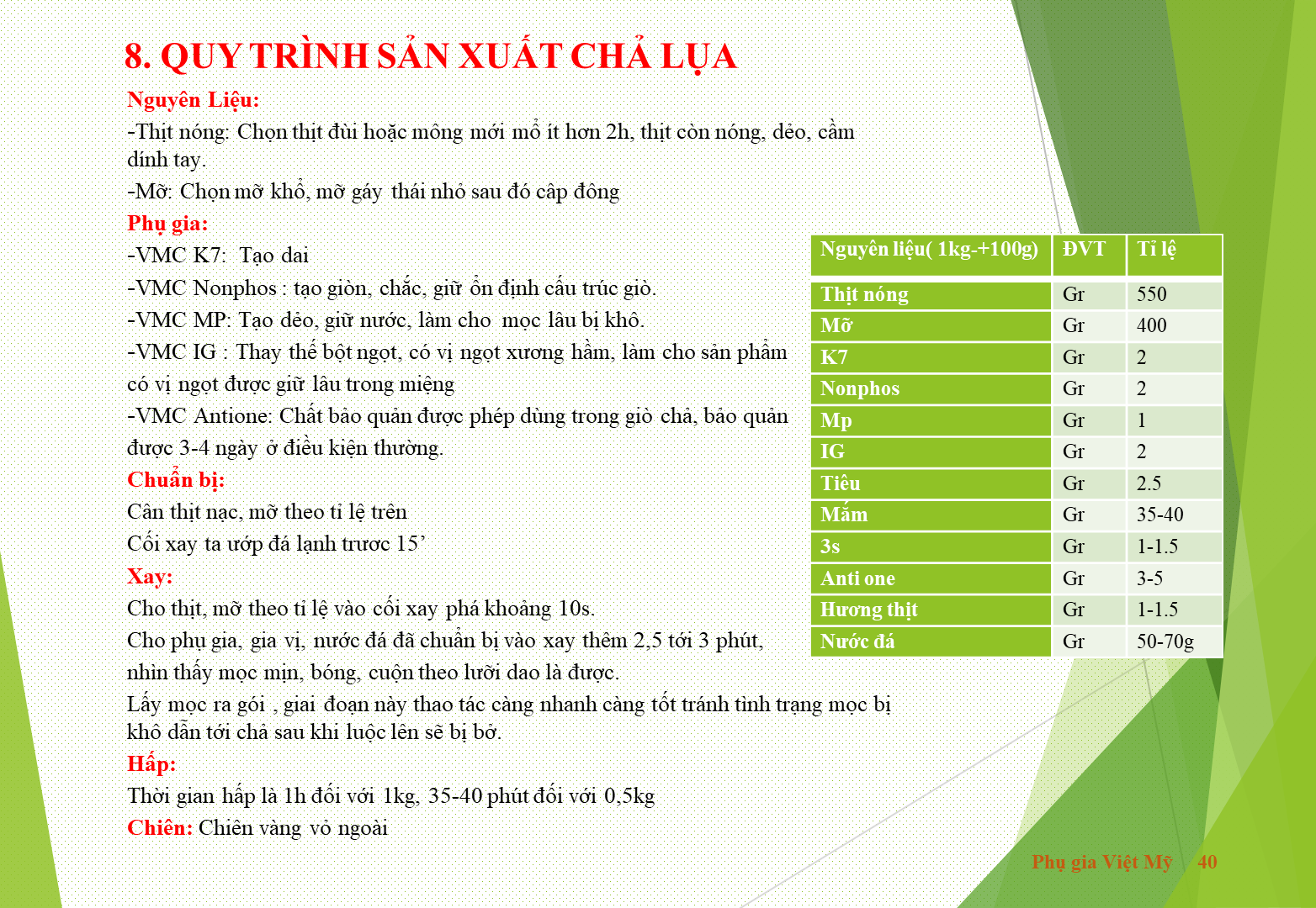 Công thức sản xuất CHẢ LỤA NGON do chính các kỹ sư của VMCGROUP sáng tạo và cải tiến không ngừng nhằm đem đến cho quý vị các sản phẩm ngày càng hoàn hảo hơn! Nâng cao được sức cạnh tranh và tạo ra sự khác biệt về chất lượng so với các cơ sở trong ngành! Hãy cùng nghiên cứu nhé!