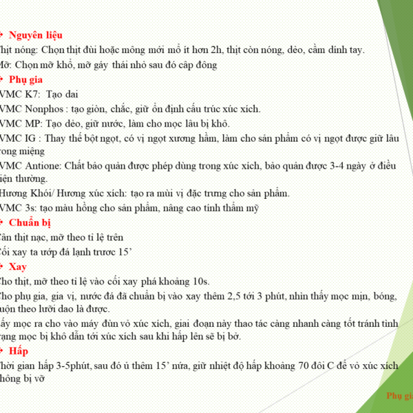 - VMC Antione: Chất bảo quản được phép dùng trong xúc xích, bảo quản được 3-4 ngày ở điều kiện thường.