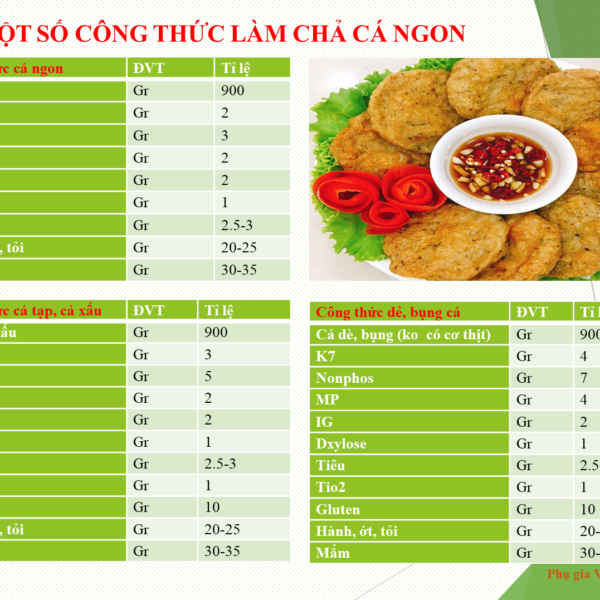 - Cá Basa, cá nươc ngọt: 3g K7, 5g nonphos, 2g MP, 2g IG, 10g gluten, 1g Dxylos.