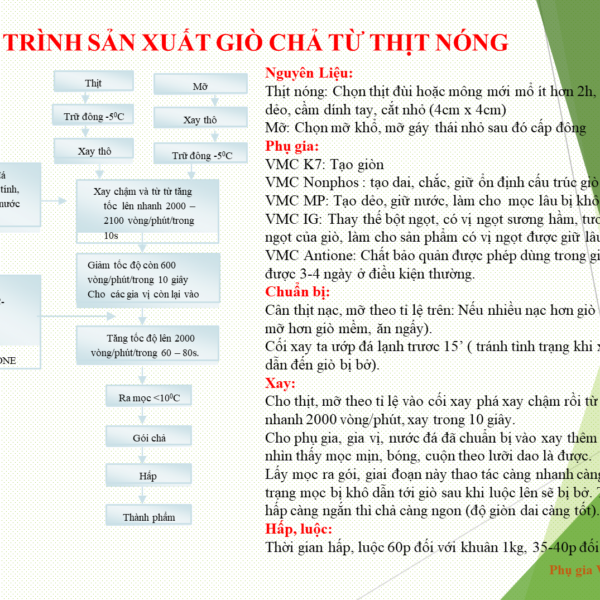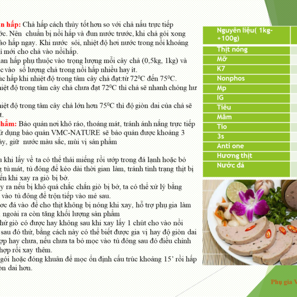 - VMC Antione: Chất bảo quản được phép dùng trong giò chả, bảo quản được 3-4 ngày ở điều kiện thường.