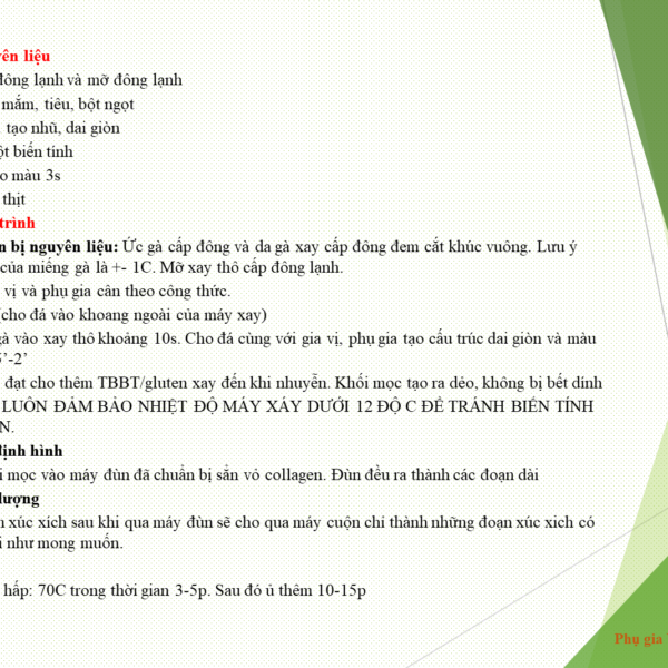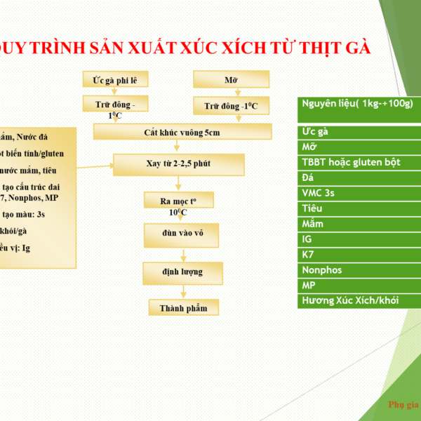 Công thức phụ gia cho xúc xích gà /(1kg -+100g) thành phẩm: